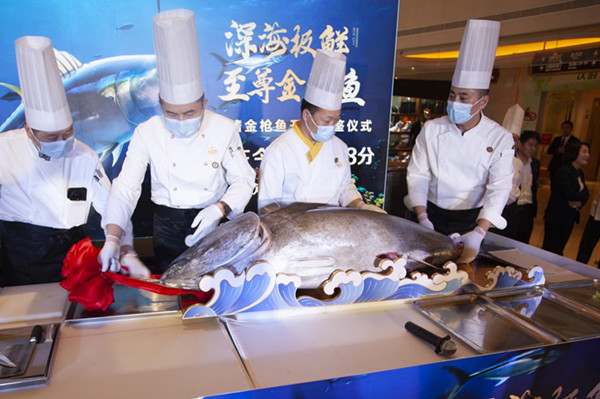 开鱼仪式结束后,在酒店厨师长精湛的刀工下,多道蓝鳍金枪鱼特色菜品及单品依次呈上。现场宾客纷纷举起手机记录美味瞬间,不时发出赞叹,沉浸在这场味觉与视觉的双重盛宴中。