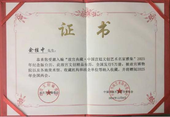 2025年故宫博物院建院100周年【中国宫廷文创艺术名家雅集】俞桂中老师作品入选制作新年台历,可喜可贺!